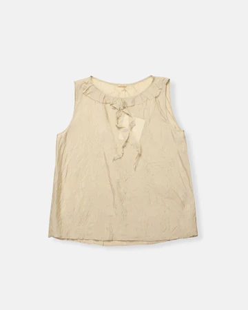 top sans manches ultra feminin avec volant léger sur col couleur : mastic beige composition : 100% soie origine : Italy size : M taille petit